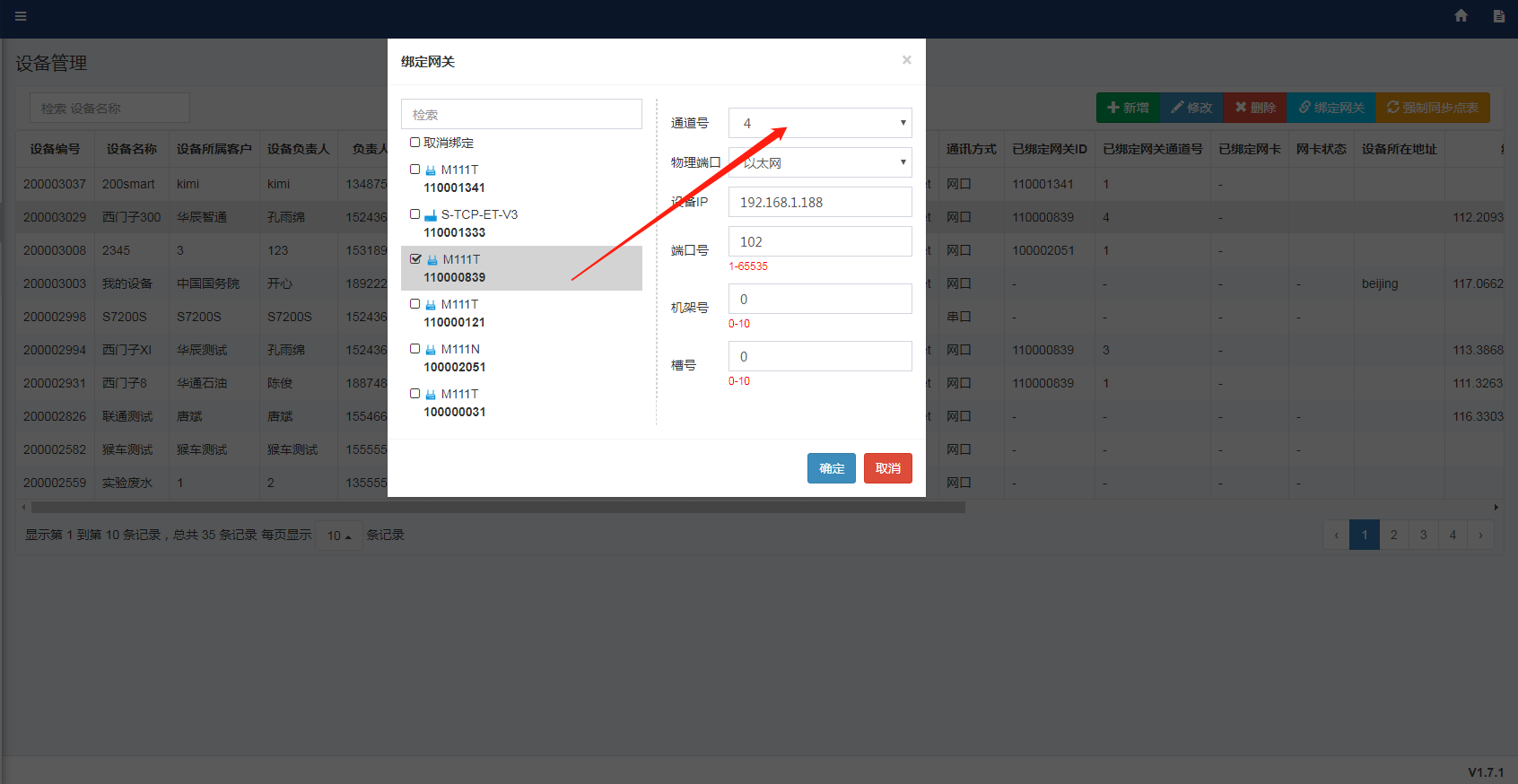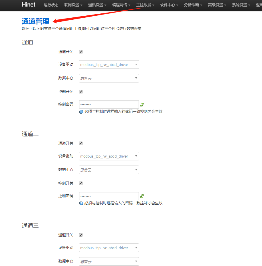 2. 后臺(tái)通道與平臺(tái)上所選通道不一致,網(wǎng)關(guān)后臺(tái)“工控?cái)?shù)據(jù) - 通道管理”打開的是通道1,思普云平臺(tái)設(shè)備管理處,設(shè)備綁定網(wǎng)關(guān)時(shí)通道選擇1。
